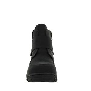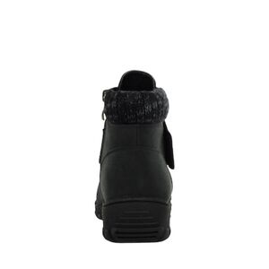 Ankle bootie in warm toned black shade, knit stretch back along the cuff and velcro closure across the top of the foot.