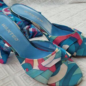 Wanted blue/pink/white fabric sandals. 4" heel. Never been worn outside of the house. Size 7 but fits a narrow 8
