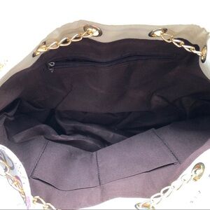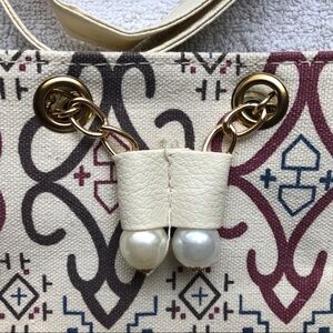 Wanyupj Hand bag, purse, satchel, bucket style bag, pink and blue pattern design, cream background, canvas fabric, chocolate brown. Pearls, chains and gold accents, Geometric pattern. Chain handle and plain cream shoulder strap included. The interior of the purse has one zipped pocket and a couple of open pockets. You can pull on the chains around the top of the purse to since the bag closed or leave open for easy access.