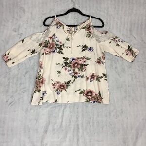 Warehouse One Cold Shoulder Top. Women's Tag Size Medium. 100& Viscose. Crepe textured, lightweight flowy fabric. Cream with large floral print. Rounded neck with single shoulder strap and keyhole rear tie. Cold shoulder with lace cut outs. Half sleeve with elastic cuffs.