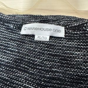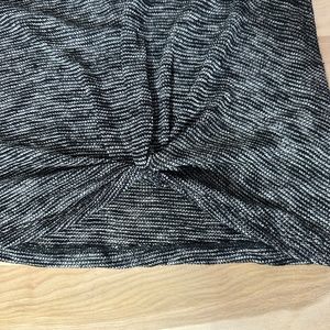 This soft, stretchy, comfy top is perfect with leggings, or can be dressed up with jeans or pants and a jacket. It is a black/grey/white knit and lightweight. There is a gather detail off to the side at the waist. It is in excellent used condition with no stains, holes, tears or runs. Size XL See photos for measurements.