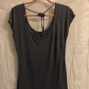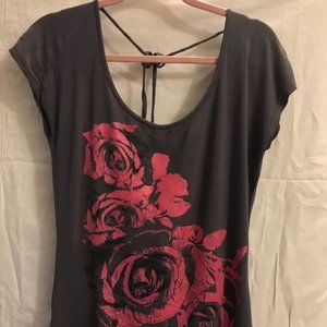 Warehouse One grey capped sleeve scoop back top, large pink rose printed on front, tie at neckline in the back, banded waist; size M
