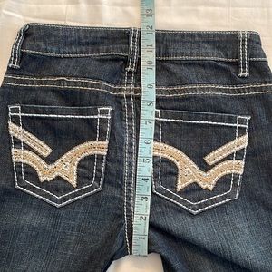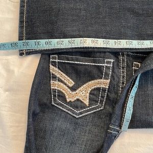 Warehouse One high rise boot cut jean in dark wash. Thick thread stitching gives these jeans some pop and the strategic fading gives them style. Front and back pockets, zip and button closure in a fabulous dark wash. Cotton with spandex for comfort and flex. In like new condition. No size tags. See photos for measurements.