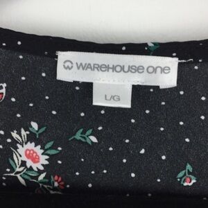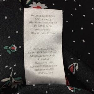 Women's Size Large. Polyester. Loose fit, satiny material. Black with red flower pattern. Rivet lace up v-neck. Button tab sleeves.