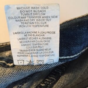 Women's Size 29 Regular. Cotton / Spandex. Mid Rise. Boot cut. Medium wash with blasting and subtle distressing. Jewelled flap on back pockets with button closure. Rhinestones on pocket studs.
