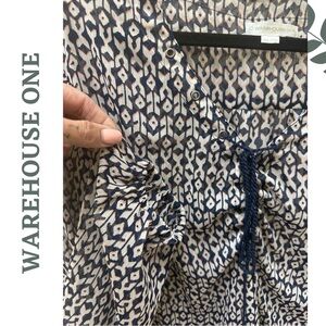 Warehouse One blue, white and pink patterned lightweight blouse. Sleeve has an elastic cuff, lace up detail at neck. Excellent condition