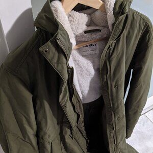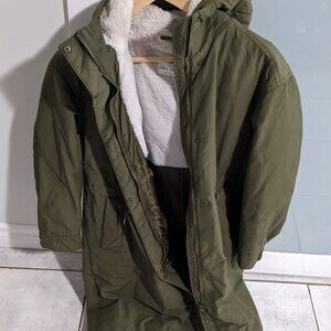 Long warm green jacket for winter. Lined with fleece inside. Used for one season. Size S.
