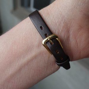New band - brown, genuine leather, with gold toned clasp (the store didn't have silver to match).