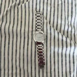 Stylish silver watch with burgundy accents. Elegant design for any occasion.