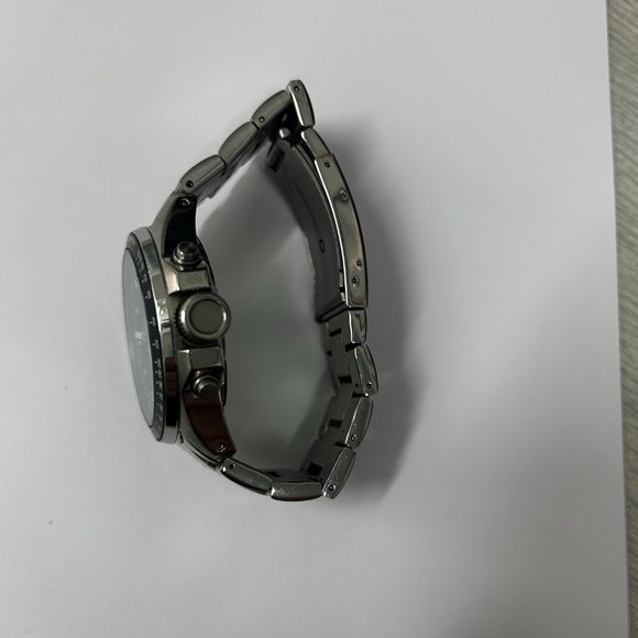 Stainless steel case with a stainless steel bracelet. Fixed blue ion-plated with tachymeter bezel. Blue dial with white hands and stick hour markers. Minute markers around the outer rim. Dial Type: Analog. Date display at the 4 o'clock position. Chronograph - three sub-dials displaying: 60 second, 60 minute and 1/10th of a second. Quartz movement. Scratch resistant mineral crystal. Solid case back. Case diameter: 44 mm. Case thickness: 14 mm. Round case shape. Band width: 22 mm. Fold over clasp. Water resistant at 100 meters / 330 feet. Functions: hours, minutes, seconds, chronograph, date. Casual watch style. Fossil Chronograph Stainless Steel