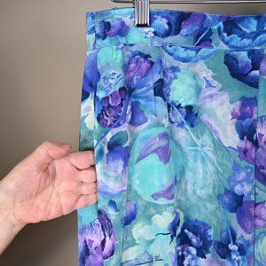 Beautiful deep watercolours in this silky feeling print skirt with zipper and button waistband. Front has a couple of pleats below the buttons on waistband, back is plain. Unlined.There is elastic in the back section of the waistband so could fit a slightly larger size. Inseam pockets on both sides. No tags to indicate brand or fibre content of fabric. May be handmade. My guess is the fabric may be polyester/rayon blend, but not sure. I think this would be a size M/L - please see measurements below. Approximate Flat Measurements: Waist 17" Hip 26" Length-top of waistband to bottom hem 36" Width at hem 29" In good pre-loved condition