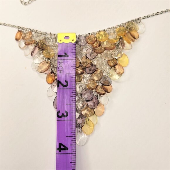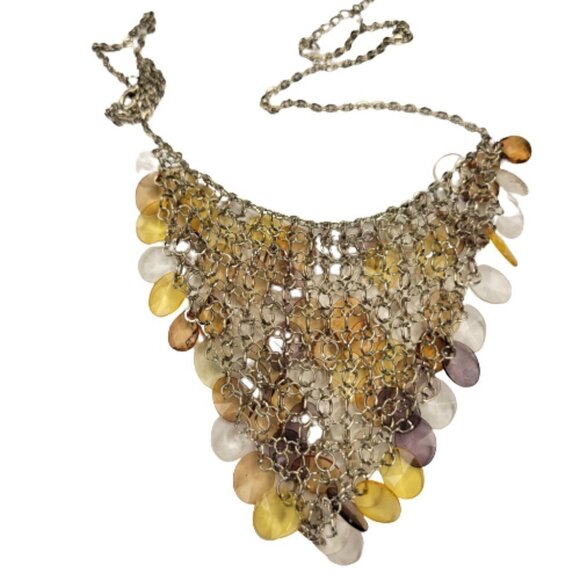 Clear Discs in pastel shades of browns and yellows in a cascading styled Bib Necklace