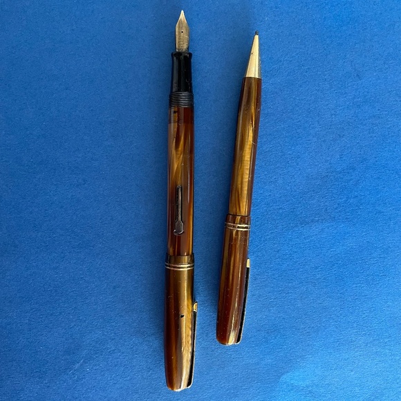 Collectible rare . Canadian Watermans Military Writing Set in Pearl Brown Marble with Gold filled Trim. Fountain Pen and Pencil both in excellent condition in original Leather Case. Set issued to Service Personal during the War. Fountain Pen fitted with the original 14kt gold semi flex medium tipped nib. Unique set , post WW2