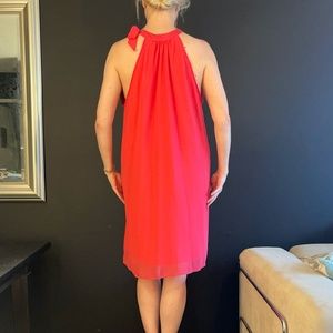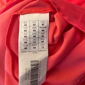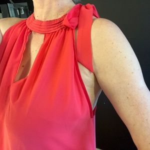 Made in Morocco, some kind of synthetic maybe nylon/viscose, double lined. Lovely bright watermelon pink. Adjustable neck tie. Deep arm holes. Can drape on a small body or fit a large chest. Flirty above the knee and bow on one shoulder.