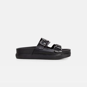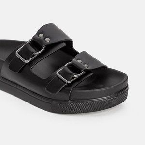 • Slip-on, open-toe faux leather sandals featuring double straps with buckle closure and a comfy sole
