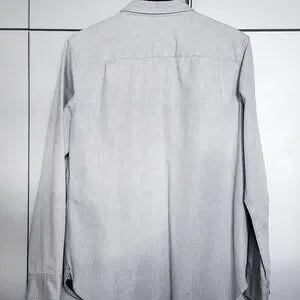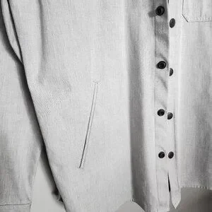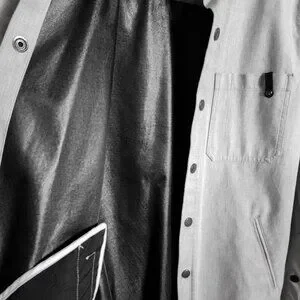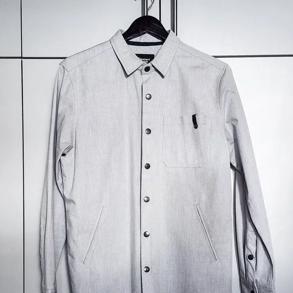 Former in-house label from Livestock. A rare and stylish Waterproof shacket / overshirt in light heather grey. Snap button closure with angled side slit pockets, breast pocket and interior pocket.