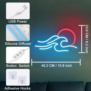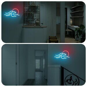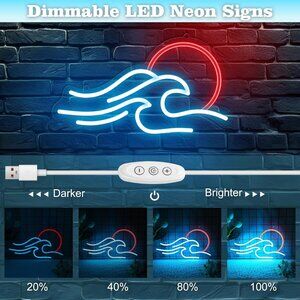 * Adjustable Brightness Neon Signs:You can adjust the brightness through the buttons on the USB cable, which is meeting your different lighting needs. The Seawave sunrise neon signs have 3 buttons ON/OFF, brightness up and down. when Turn OFF and then Turn ON this wave neon sign again, the neon light will stay the same previous brightness. No more harassment to resetting the brightness again.