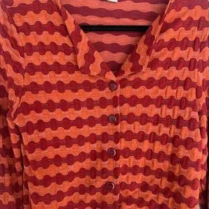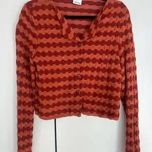 Add a touch of style with this rust cardigan featuring a unique wave pattern. Perfect for layering and adding warmth to your outfit.