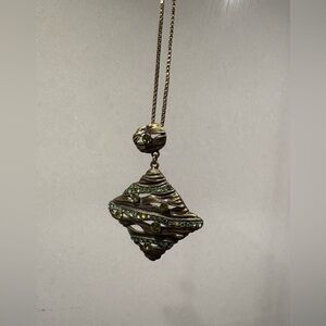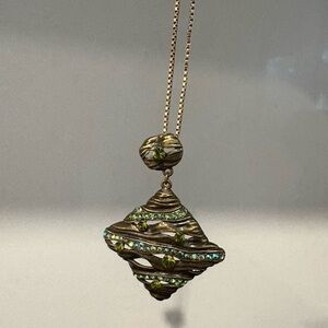 The pendant hangs from a decorative bail with a matching textured gold-tone design and a single green rhinestone accent. This piece would add a touch of vintage glamour and a pop of subtle color to any outfit.