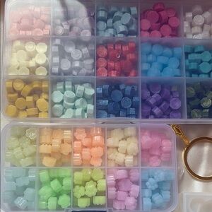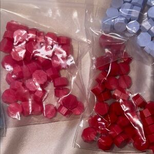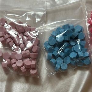 Complete wax seal kit featuring pink and gold accents. Includes various wax colors and sealing tools.