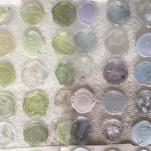 Four sheets with 18 stickers each (one sheet of each shade: pink, blue, green, and tan).