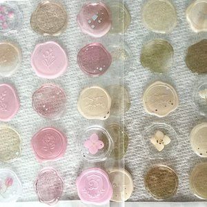 Four sheets with 18 stickers each (one sheet of each shade: pink, blue, green, and tan).