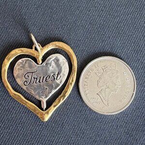 Waxing Poetic Truest Pendant. Beautiful two sided sterling silver heart pendant. Surrounded by a brass heart. Pendant spins.One side features inset swarovski crystals and the other side has the word Truest engraved on it.Comes in a Waxing Poetic pouch. This is from the inventory of a gallery/shop I owned. New, never worn.
