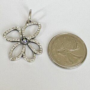 Pendant by Waxing Poetic. Open violet flower in sterling silver set with swarovski crystals.The centre crystal is violet in colour.The pendant has a large sterling silver ring to accommodate most chains. Includes Waxing Poetic pouch. This piece is part of the inventory from the gallery/shop I used to own.