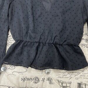 This stylish black blouse features a flattering peplum waist and billowy puff sleeves that add a touch of romance. The fabric has a textured finish, enhancing its elegant appearance, making it a perfect choice for both casual and dressy occasions.