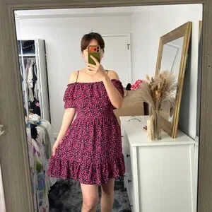 Off-shoulder mini dress with layered ruffle bodice. Smocked waist for a cinched silhouette. Delicate pink floral pattern on a darker base. Thin adjustable straps and short flutter sleeves. Flirty ruffled hem for movement.