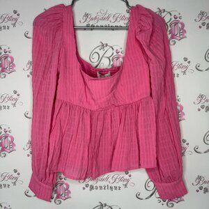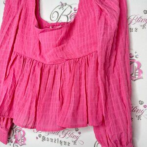 Wayf top long sleeve pink plaid print puff shoulders cute with button cuffs BNWT