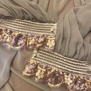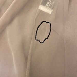 Made from the softest polyester I’ve ever touched. Such a beautiful shade of grey mauve. Lovely flowy sleeves with generous shoulder pads.
