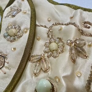 I now have a big dog, won’t fit on a Dalmatian. Ivory cream gold color. Satin silky fabric. Lined with black fabric inside.