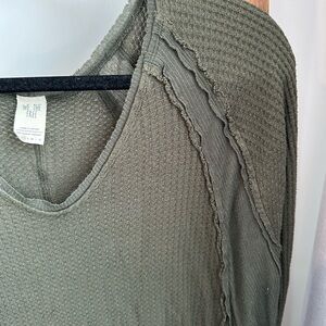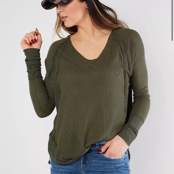 Embrace comfort and style with this green long sleeve shirt from We The Free. Featuring a relaxed fit and ribbed details, this top is perfect for casual outings. Its versatile design makes it a must-have addition to your wardrobe.