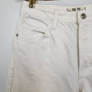 White denim hi rise jeans. Cropped with flare and raw hem edge Classic 5 pocket design with a button fly close