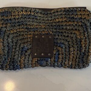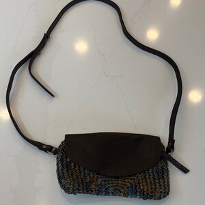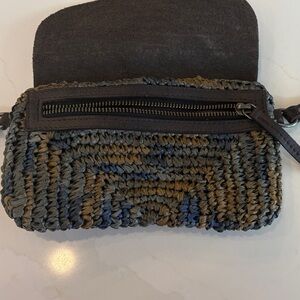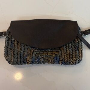 Features: Raffia straw in a woven design, soft leather flap, zipper closure, thin adjustable strap, compact design
