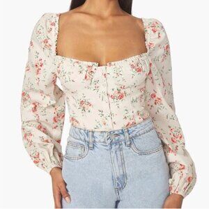 WeWoreWhat Ruched Dainty Floral Top Bustier Pouf Sleeves Cream Pink ~ Size Large ~ 95% Cotton, 5% Spandex ~ BRAND NEW WITHOUT TAGS NWOT (extra button was attached to the brand name tag and I cut it off indicating that this is brand new and never worn and you can tell it's new by the feel of it and it looks like it's never been worn or washed)