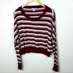 Wearing Your Heart on Your Sleeve Raglan Striped Sweater in Women's Size Medium. Cuffed hems. Round neck. Striped pattern. Burgundy and white. 60% cotton and 40% rayon. Machine washable. Very good pre-loved condition. No visible flaws.