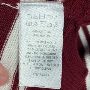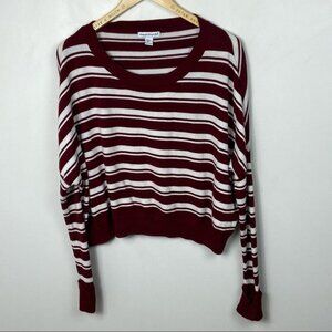 Wearing Your Heart on Your Sleeve Raglan Striped Sweater in Women's Size Medium. Cuffed hems. Round neck. Striped pattern. Burgundy and white. 60% cotton and 40% rayon. Machine washable. Very good pre-loved condition. No visible flaws.