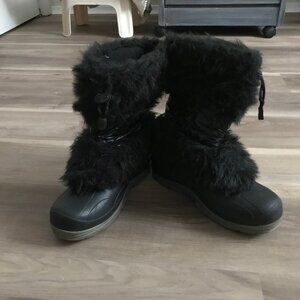 Two layers of faux fur with a strip of polyurethane in between on the outside. The boots are slip on with a toggle fastener at the top, and a thick rubber sole. The inside is lined, thick and warm for Canadian climates. Made in Canada. Good condition hardly worn.