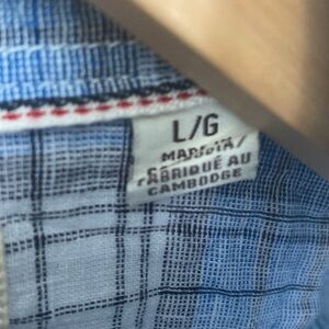 DESCRIPTION: The Perfect summer Short Sleeve Button Down. In breezy lightweight cotton/ linen blend. Blue/grey /white