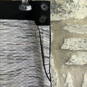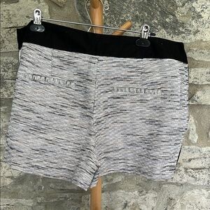 these stylish women's shorts feature a chic weave look design in black, gray, white and beige. these shorts are perfect for any occasion. It has front and back pockets, black waist band and side 2 button and simpler closure. It has black piping along sides and front pockets. Cotton blend. . Enjoy comfort and style in one versatile piece. Measurements in pics: waist and length.