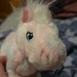 Soft and cuddly plush pony toy in pink and white. Perfect for imaginative play and snuggling.