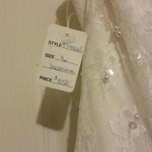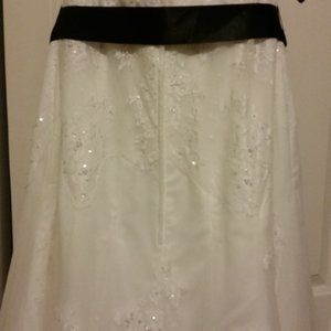Jasmine Sz 16. White, strapless dress, adorned with small beads, shine and lace. Crinoline underskirt, black waist sash. Love the dress but not the sash color? Simply buy a replacement sash or belt!