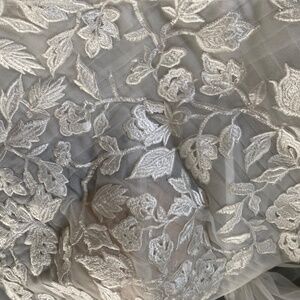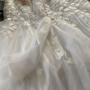 Brand New Plus Size Wedding Dress. Never worn & never altered. Floor length with longer train and bustle. Has 4 bottom layers with built in bra cups. Zipper back with tie for bustle. Welcome to try on before buying. Carry bag included) Paid $1241. It features a sweetheart neckline with tulle and lace appliqué. Off-the-shoulder tulle straps. The look is complete with a chapel-length A-line skirt.