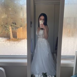 A-line V-neck Floor-length Tulle Wedding Dress or Prom Dress with sequinsI’m selling my wedding gown from JJ’s house. This a-line dress has a beautiful embroidery on the front part & looks even better in person. This was unused and unaltered. Free unused veil.