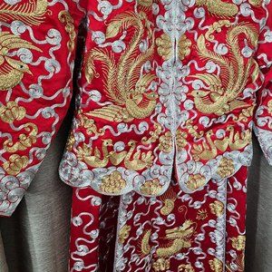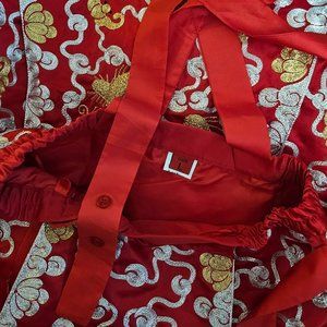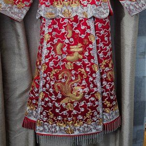 Excellent Used Condition: only wear this at home for less than an hour during Chinese tea ceremony on our wedding day. The size tag on it is L and and the measurement information provided by the seller site is Shoulder width 40cm, Chest 96cm and Waist 81cm. Body measurement for female in the picture: sholder38cm bare chest89cm waist76cm hip98cm height160cm. Fabric is a non-stretchable material. Zip up shirt. Stretchable waist dress.