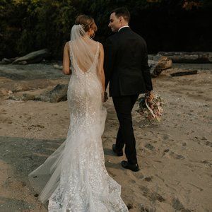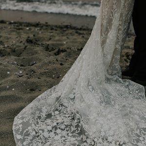 Beautiful dress with delicate 3D floral design and subtle shimmer that needs to find a new bride to celebrate another day with!