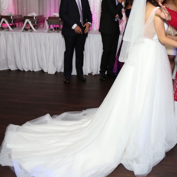 This gown is a true fairytale masterpiece, designed to make any bride feel like a princess. The dress features a voluminous puffy ball gown skirt, layered with tulle and organza for a dramatic, floating effect. The bodice is heavily embellished with sparkling stones, crystals, and beadwork, catching the light beautifully with every movement. A fitted corset-style top cinches the waist, enhancing the regal silhouette, while the off-shoulder or sweetheart neckline adds a romantic touch. The skirt cascades down in grand fullness, creating a magical, Cinderella-like aura.