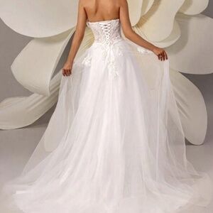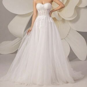Step into your fairytale with this breathtaking strapless A-line wedding gown, designed to make you feel effortlessly elegant and unforgettable on your special day.